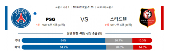 파리생제르맹 스타드렌 리게1분석 해외스포츠 2월26일