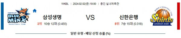 삼성생명 신한은행 WKBL프로농구분석 국내스포츠 무료중계 2월2일