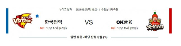 한국전력 OK금융 V리그 남자배구분석 국내스포츠 3월7일