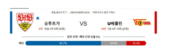 - 우니온 베를린은 최근 3경기에서 무승부를 기록하며 다소 부진한 모습을 보이고 있지만, 슈투트가르트 원정 경기에서 승리를 거둔 경험이 있습니다.