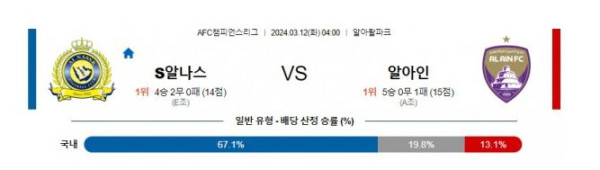 - 무승부: 공격적인 알아인과 수비적인 변수가 발생한 알나스르의 경기는 무승부 가능성이 높습니다 (추천 o)