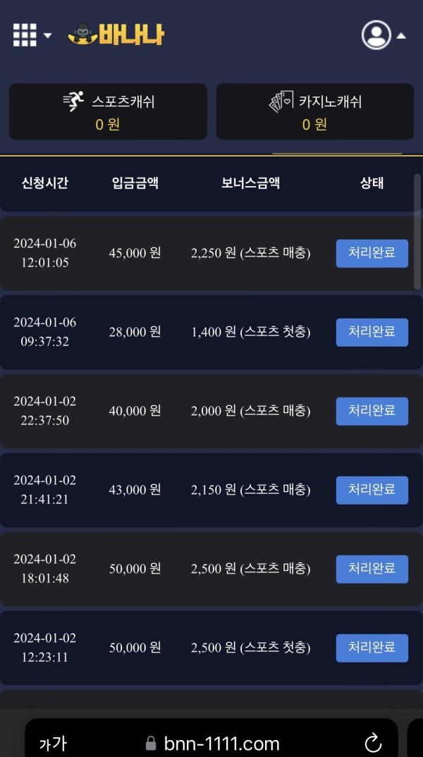 바나나 충전은 빠른거같습니다 그동안 이용한곳중에서요 아직 환전은 안해봐서 내역은 없지만 이벤트도 다양해서 좋은거같구 스포츠도 적중처리가 예를들어 오버 걸었으면 그기준점이상 찍었으면 바로 오버가 되는게 좋은거같아요 고객센터 운영진분들도 답장도 빠르셔서 이용하기 수월할거같아요 모두 건승하세요