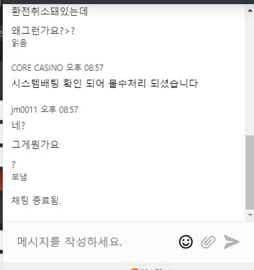 환전30분 넘게 걸려서 문의하니 게임로그반영 한다고 조금걸리고 환전량 따라 대기시간걸린다고 하더니 조금있다가 환전취소 당해서 문의하니 시스템배팅이라고 하더니 머냐고 물어보니 답변없이 바로 라이브챗막고 아이디 팅궛습니다 먼 대화라도 해야지 원금도 먹고 답답해 미칠것같네요