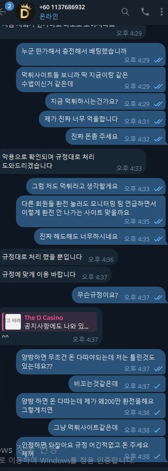 살아생전 살다가 도박 하면서 입먹 당하는건 처음이네요 가입하고 50만원충전해서 입플 받아서 배팅하고 200만원 환전 신청 하니까 환전 취소 시키더니 텔래그램 하라고 해서 하니까 다짜고짜 모니터링 결과 양방이라고 말하는 사이트입니다 제가 봤을땐 다른 회원들도 환전신청 하면 모니터링팀 언급하면서 다 먹튀할 새끼들입니다 여기 이용하지마십쇼