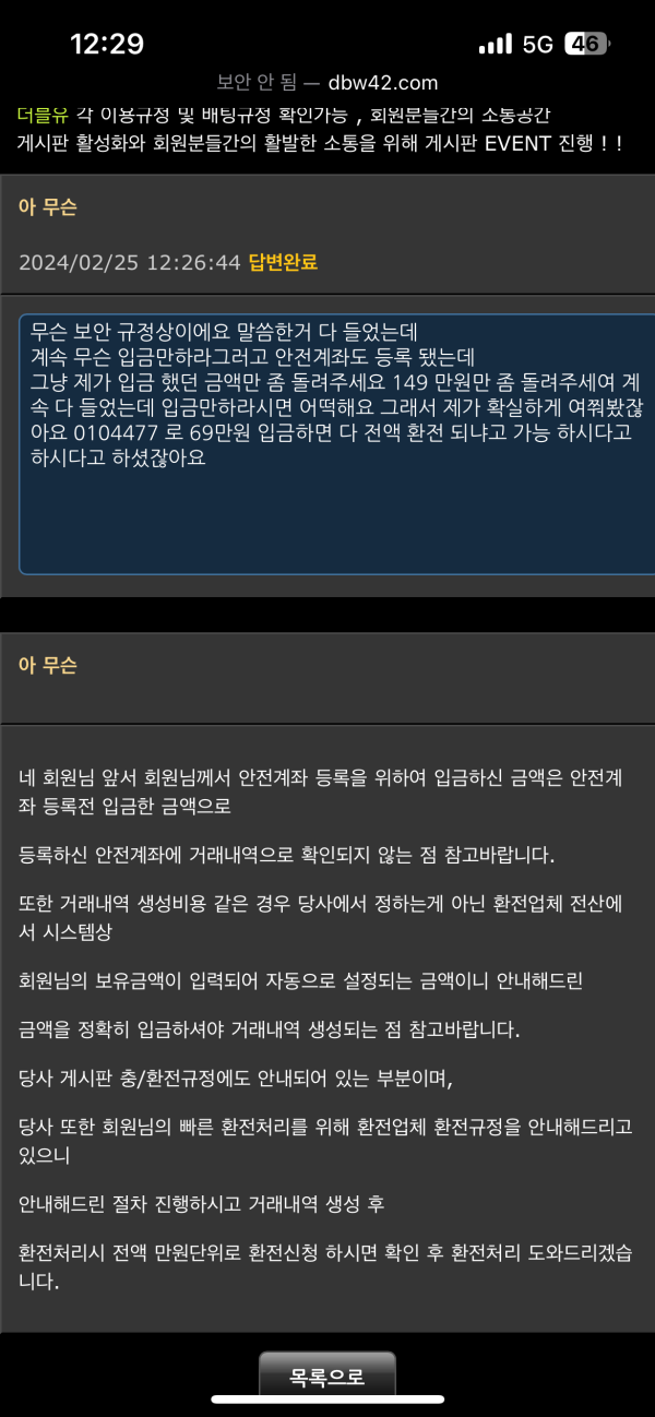 원래 사이트 이용하던데가 아니여서 꺼림찍했는데 39풀베 축구 걸어서 두배 됌 환전 하려고 했는데 안전계좌 등록하라고 39입금 하라고함 그 이후 무슨 입금자명을 계좌 등록한 번호로 하라고해서 다시 입금 했는데 거래내역 만들어야된다면서 다시 입금하라고함 또 입금하고 환전 하려는데 이제 안전계좌등록됐고 거래 필요하다고함  전형적인 사기 수법같은데 .. 하 미치겠네요