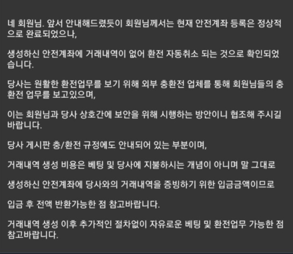 제가 처음에 39만원을 문자로 받아서 배팅100프로 한다면 출금도와준다고 하더군요 그래서 아무것도 모른채로 배팅을했고 200넘는돈을 땄습니다 그러고나서 환전을 요청하니 안전계좌를 등록해야 환전이 된다고 하더군요 그래서 99만원을 입금했고 예금주명이 아니라 계좌7자리를 기제해야 안전계좌가 만들어진다고 다시 입금요청을 하길래 구칙에도 써있어서 다시 99만원을 입금했습니다 그랬더니 계좌 거래내역을 이번엔 만들어야한다면서 지금있는돈의 50프로인 250을 주라고 하더라구요 너무 어지러워서 250입금 안했습니다 조심하세요
