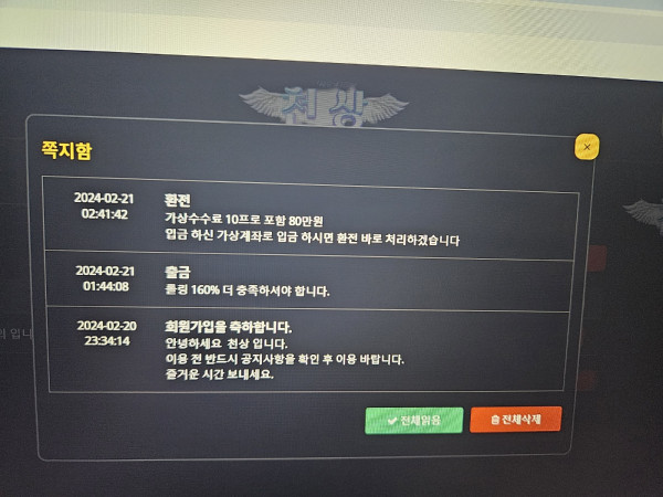 게임하는 도중에 몇번이나 불안하여 중간중간 정산을 하려 환전을 신청하였지만